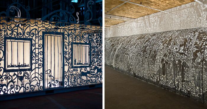 Steel, very often associated with strong masculinity, thanks to Cal Lane, gets a completely different shape. The artist softens its image by carving lace-like patterns which significantly transform its presentation into something much more feminine. This way we can watch the paradox of these two worlds merging together. Lane uses various materials like car and truck hoods, spades, wheelbarrows, oil drums, and others. When it comes to the patterns Cal chooses for her laces, they very often have references to religion and also hint at lace’s metaphorical capacity to both expose and conceal.