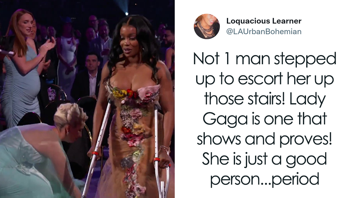 After falling out of a bed and injuring her ankle days earlier, SZA made her way to the stage on crutches. Her dress was a skintight mermaid-cut Jean Paul Gaultier gown with a long tulle train, and although gorgeous, it made it harder to move. SZA looked to be struggling as she tried to move quickly towards the stage.