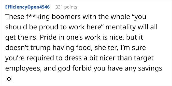 Load More Replies...I am so sick of people playing the blame game on "Boomers". We are not all totally loyal to our lifelong employers; don't always stay in a marriage because our parents did and little of the crap spewed by pissy whiners that all society ills leads back to the aging generation. Please knock it off, @efficiencyopen4546, personally I'm sick of hearing it.