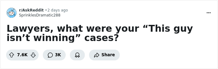 Internet user u/SprinklesDramatic288 sparked a venting session on AskReddit, as a bunch of lawyers spilled the tea about what their jobs are really like and the very worst clients they ever had. These are the type of people who have no survival instinct and behave in such dumb ways that there is no way they’d win their cases. Check out these legal pros’ stories below—just be warned, they’re facepalmworthy.