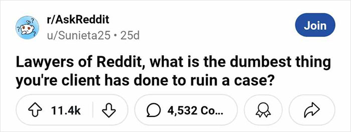 However, some folks have such big egos that they won’t listen to common sense or genuinely good expert advice. Inspired by user u/Sunieta25, the lawyers of Reddit spilled some hot tea about the dumbest things their clients did to ruin their cases, and it was jaw-dropping. We’ve collected some of the spiciest stories to share with you. Scroll down to check them out!
