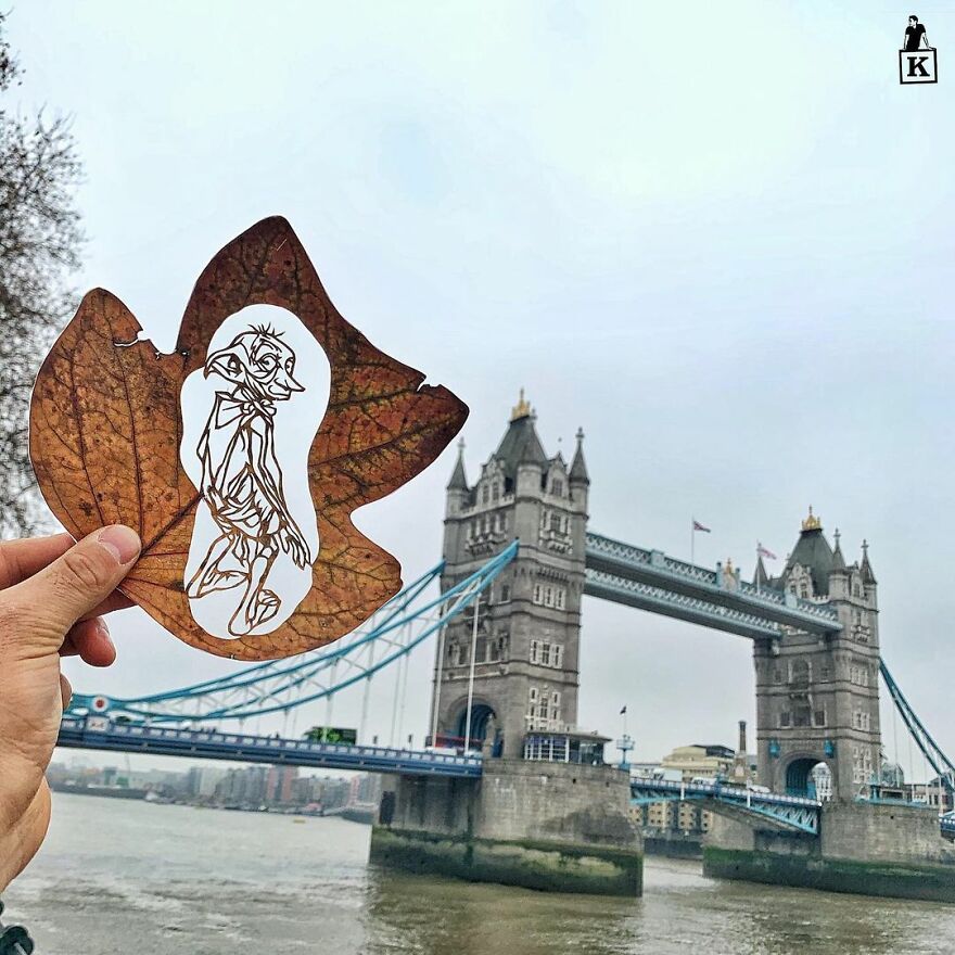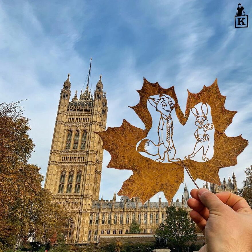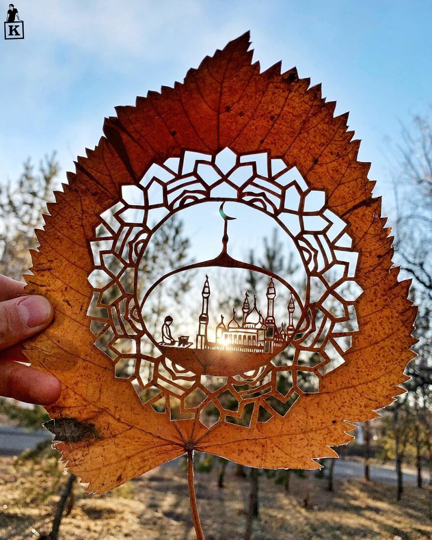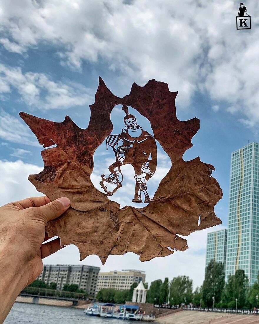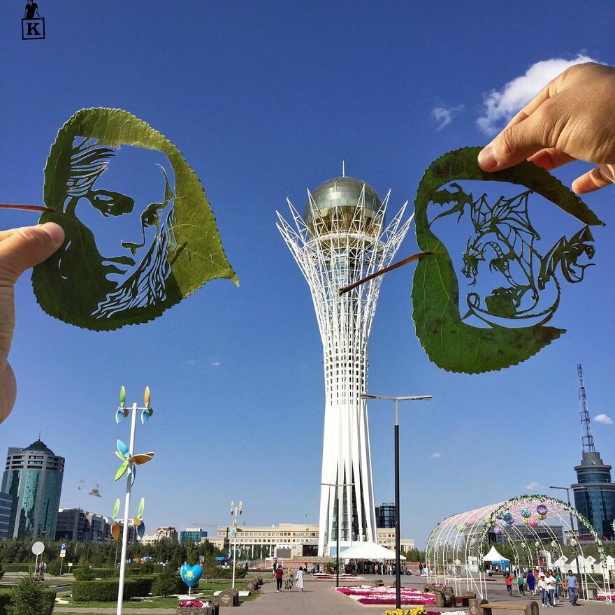 To tell it from the beginning, I collect good-looking leaves (usually in late summer and autumn), making sure that they are the correct size. I prefer to use maple leaves, I like their color, texture and shape. It looks very beautiful in a picture. Then I draw on paper, making sure that I know what parts have to be cut, then I glue paper on the leaf and cut the drawing with a razor knife. Paper gives additional support to the leaf. I press the leaf and make sure that the glue has dried enough. If I take it too early, the leaf just shrinks. Then I look for a good place with a beautiful recognizable background to take a picture. It took time for me to realize what's the perfect angle to take and time to choose for photo shooting. Then I make some edits with photo editing tools and post the picture to my Instagram. Roughly one work can take up to 2 weeks from the beginning to the final stage.