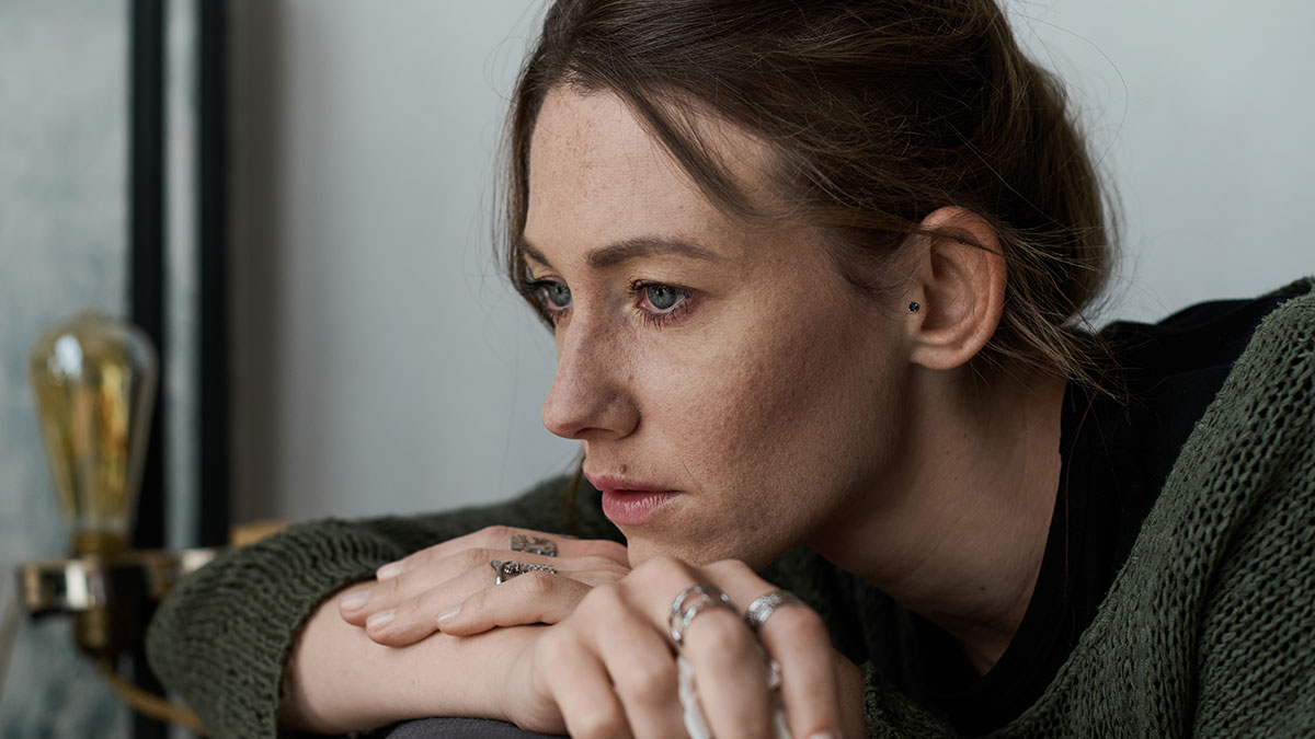 Woman looking distressed and thoughtful at home, reflecting on man's marriage on the rocks after learning about a 12-year-old daughter.