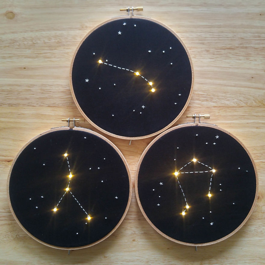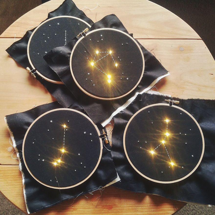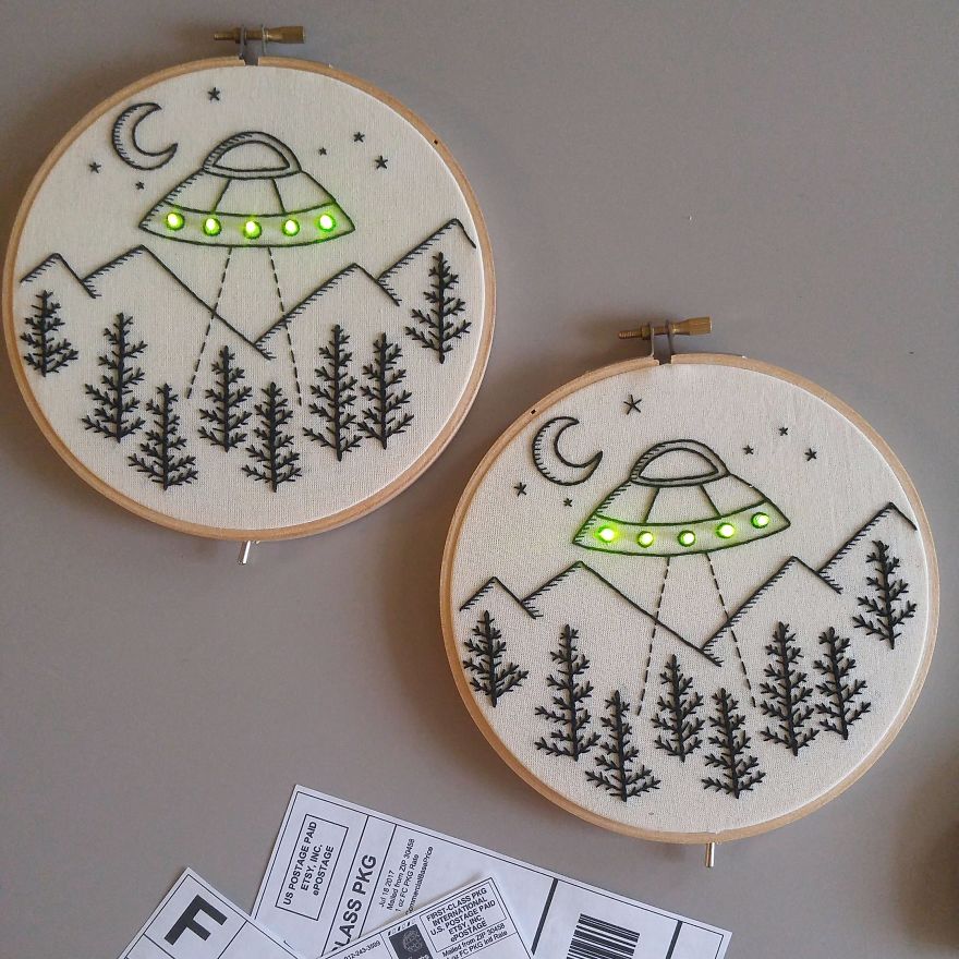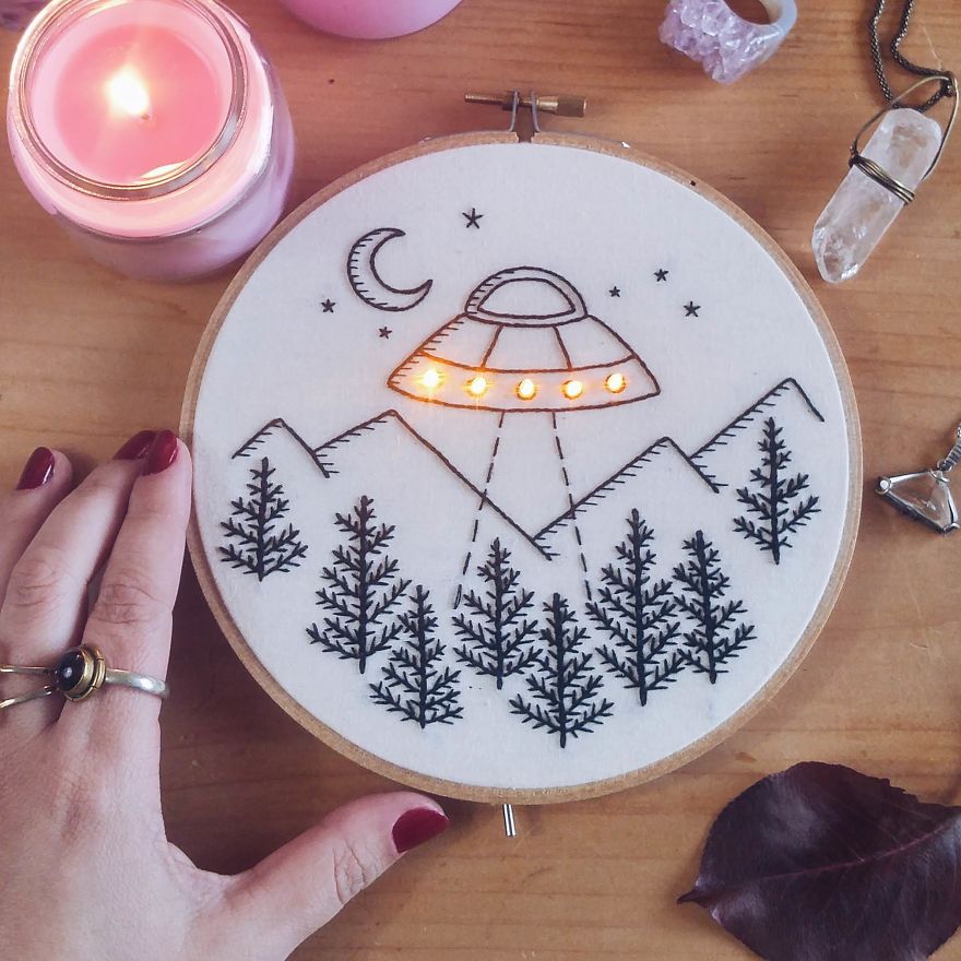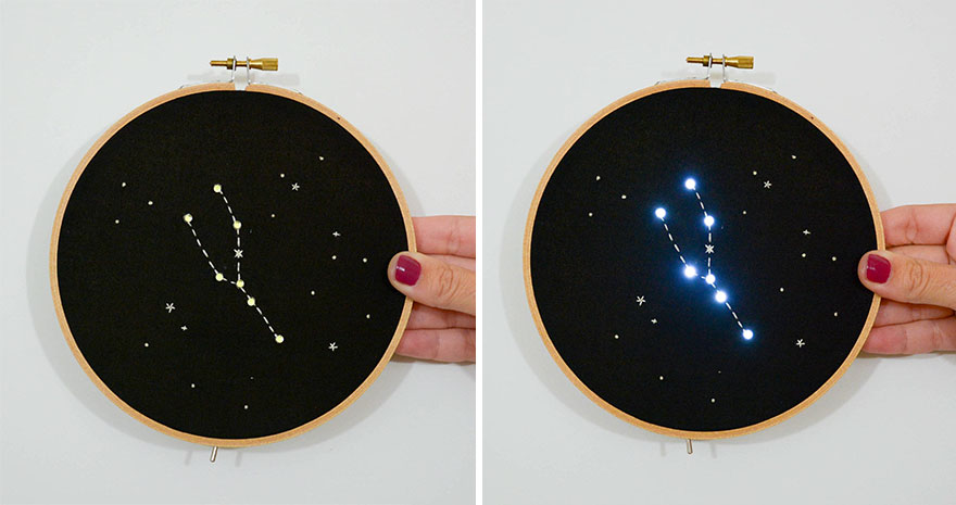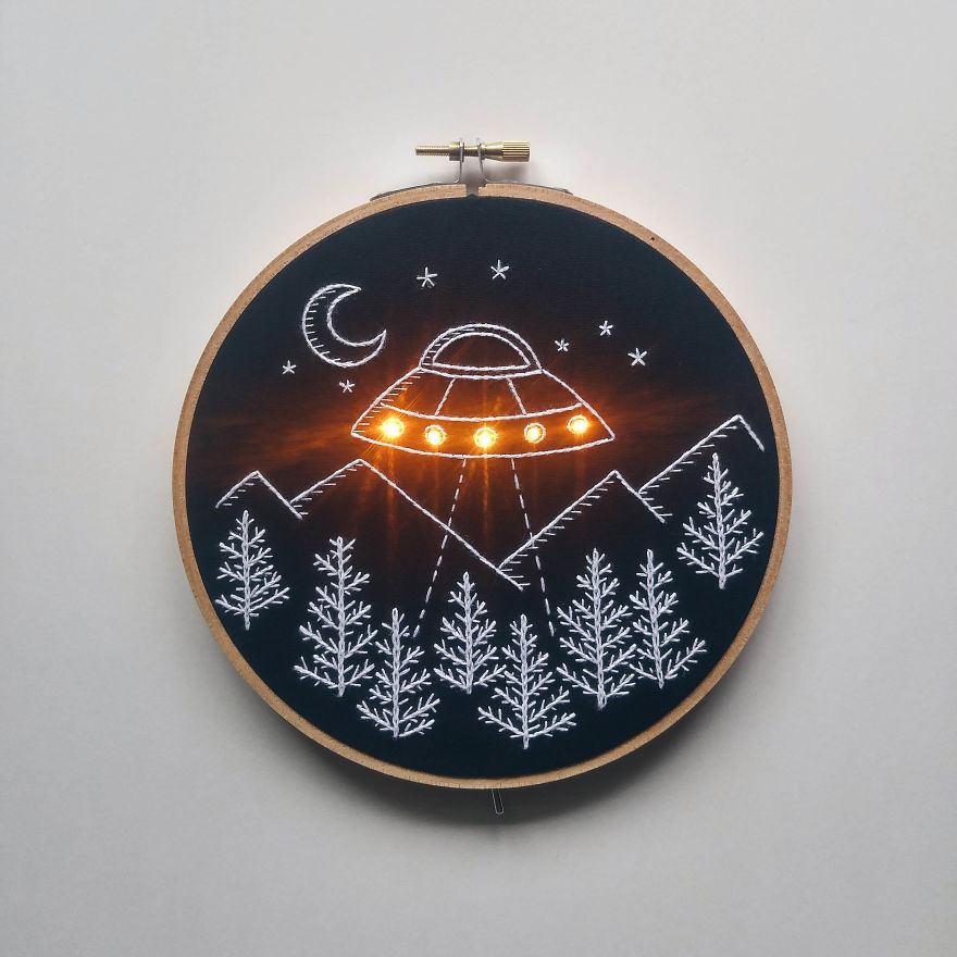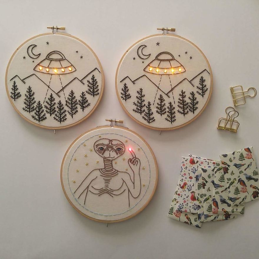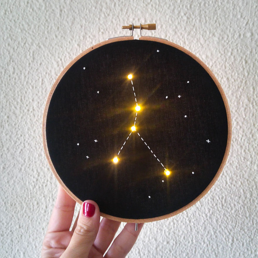 My embroidered designs have always been with a more modern footprint, not at all like the designs my mother taught me, but I still had not added the LEDs. The first embroidery I made with LEDs was made to give of wedding gift. My husband works with electronics, technology, and stuffs like that, and together we came up with the idea of making a special gift that would bring my skills and his abilities as well. We loved the result. When we moved to the United States, here I continued working on my project À mão and thought about creating a series of embroideries with these little lights, since I had liked the result so much. He taught me the whole electronic part and so was born the embroidery collection with LEDs, where I use fabric, embroidery floss, LED lights, resistors, switches and a few more components to create starry skies, UFOs, ETs, Zodiac constellations, planets and all those cosmic elements that are my inspiration.