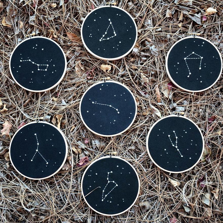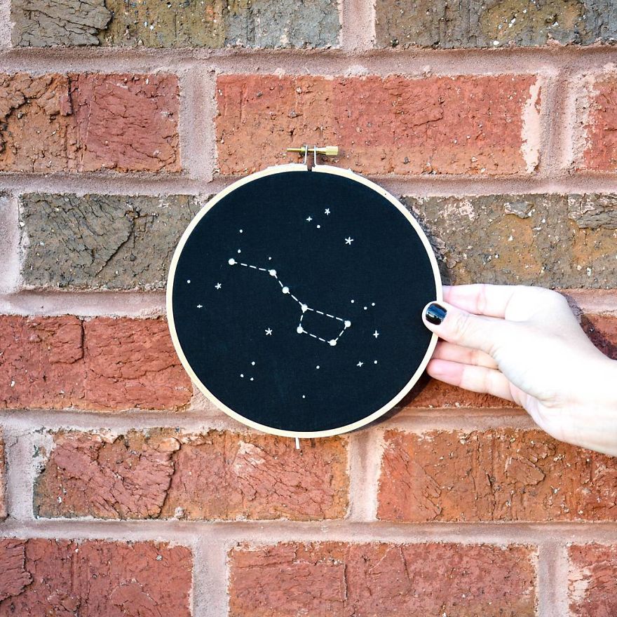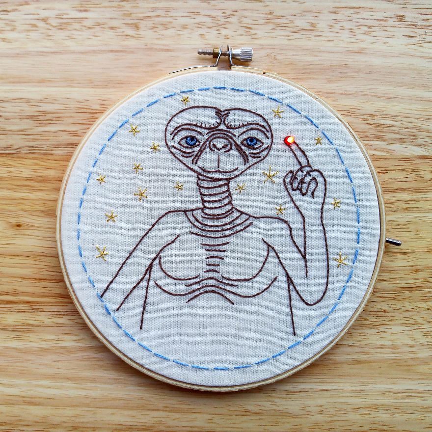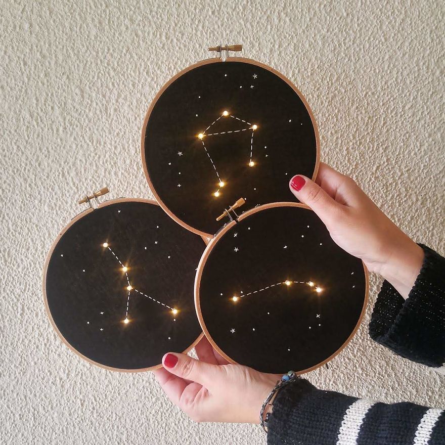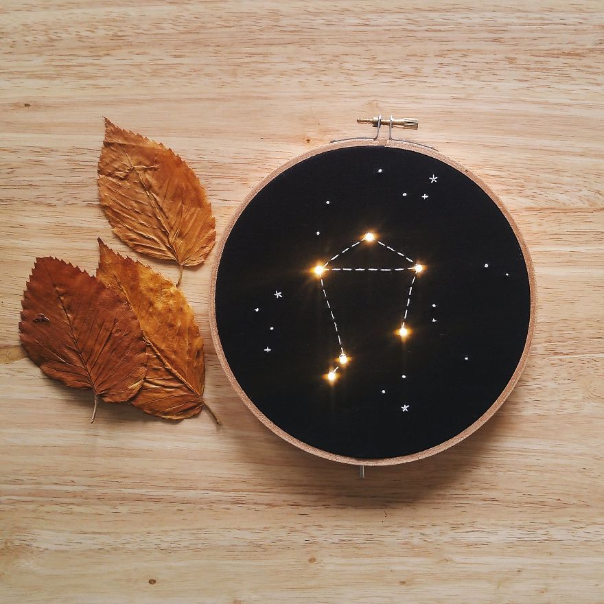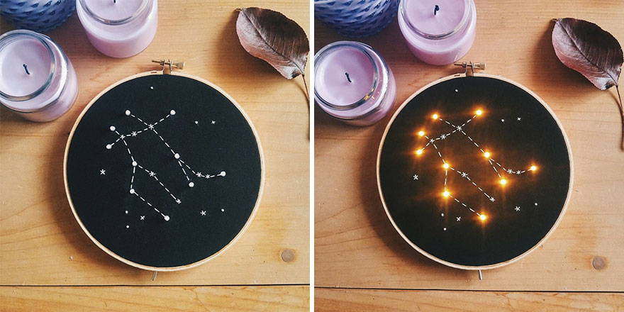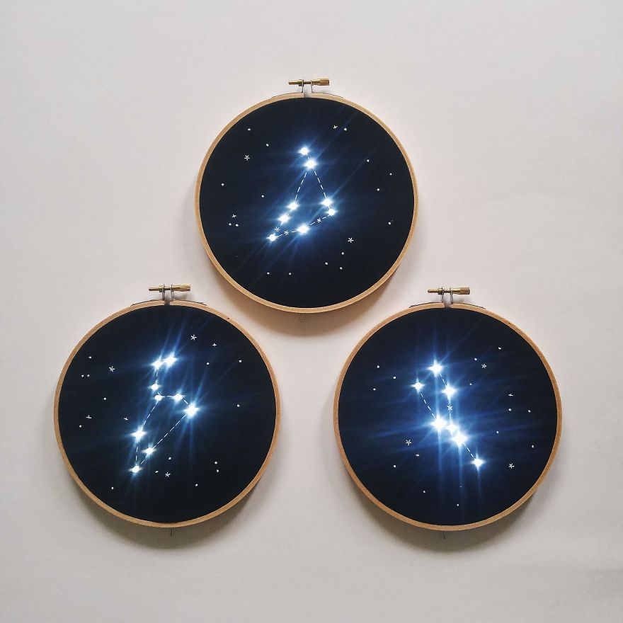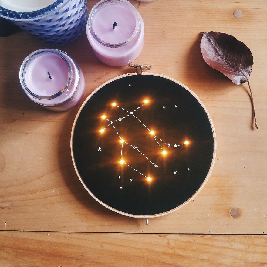 My embroidered designs have always been with a more modern footprint, not at all like the designs my mother taught me, but I still had not added the LEDs. The first embroidery I made with LEDs was made to give of wedding gift. My husband works with electronics, technology, and stuffs like that, and together we came up with the idea of making a special gift that would bring my skills and his abilities as well. We loved the result. When we moved to the United States, here I continued working on my project À mão and thought about creating a series of embroideries with these little lights, since I had liked the result so much. He taught me the whole electronic part and so was born the embroidery collection with LEDs, where I use fabric, embroidery floss, LED lights, resistors, switches and a few more components to create starry skies, UFOs, ETs, Zodiac constellations, planets and all those cosmic elements that are my inspiration.