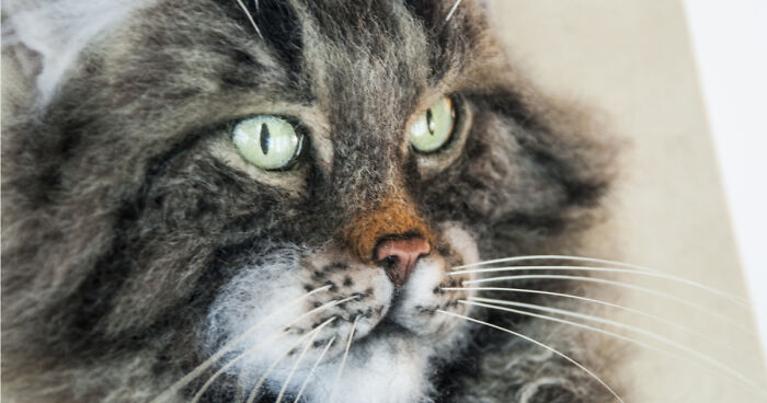 In honor of this holiday, I want to show you some of my works inspired by cats. I created these portraits using the dry felting technique from natural sheep’s wool. I use dozens of different shades of fibers to make the cat’s coat look realistic. I paint the eyes for each portrait myself and use glass cabochons. The cat’s whiskers are real, but not a single animal was hurt! My friends, who have cats, collect their cats’ whiskers that fall naturally point and send them to me from all over the world.