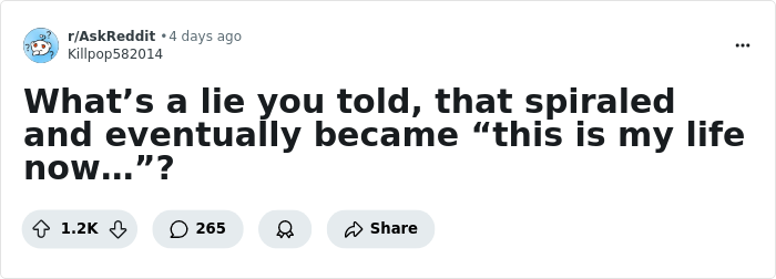 That’s exactly what one Redditor explored when they asked: “What’s a lie you told, that spiraled and eventually became ‘this is my life now’?” The answers? Hilarious, heartwarming and occasionally heartbreaking, but deeply relatable.
