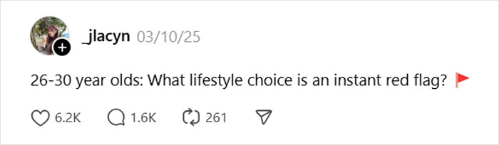 Someone asked “26-30 year old's: What lifestyle choice is an instant red flag?” and netizens shared their examples. So get comfortable as you scroll through, upvote your favorite examples and add your own thoughts in the comments below.