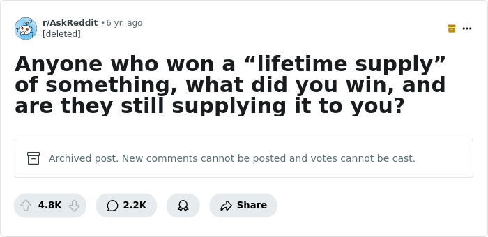To get a firsthand account of what it’s like to win these promos, we’ve collected these responses to a Reddit thread from a while back. A user asked, “Anyone who won a ‘lifetime supply’ of something, what did you win, and are they still supplying it to you?”