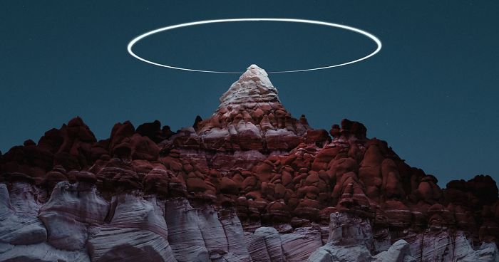 While using his drone to light up the majestic mountain scenes, he began capturing the light paths of the drone with long exposure and discovered that this added another element to his images. “The first part of the series intentionally removes any sign of the light source to leave just the illuminated landscape,” Reuben explained to Bored Panda. “This second series makes a feature of the light drawings of the drone as it lights the landscape, and one of the features the drone has is a circular orbit mode around a ‘point of interest’. It was an intentional move, but the whole process for me is experimental.” This ‘halo’ effect is particularly impressive!