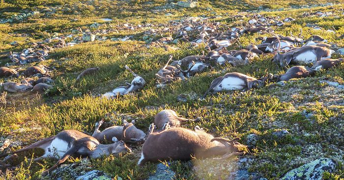 An official from the Norwegian Nature Inspectorate (NNI) was on duty when he stumbled upon a mass animal graveyard. Dead reindeer were lying on the ground very close to each other. A total of 323 animals (including 70 calves and 5 that had to be euthanized) were confirmed dead and lightning is thought to be the cause.