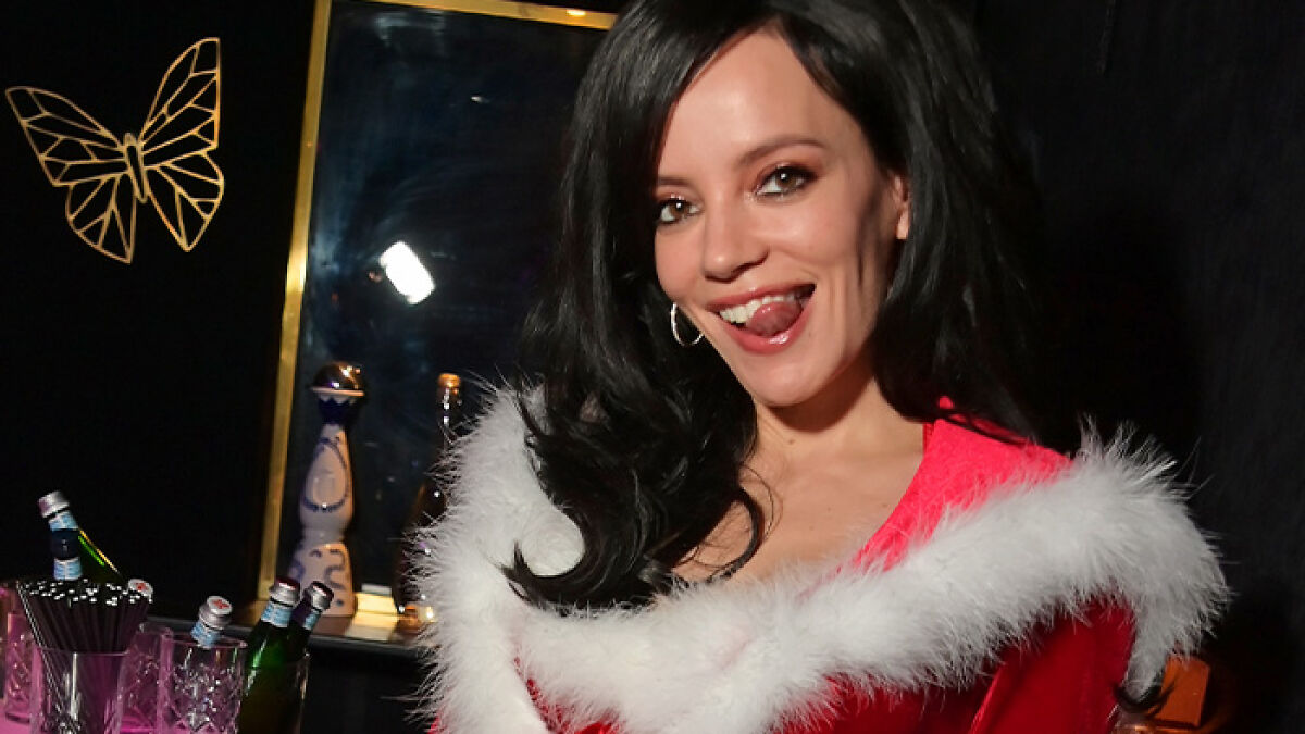 Lily Allen made a dramatic appearance at her London Christmas party. She donned a Santa-inspired red velvet mini dress trimmed with white fur. Allen completed her look with a matching long coat and white stockings.