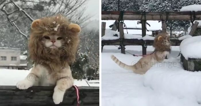 Like this homeless dog proved, to be a lion you don’t need to be born one – you just have to have the spirit. Jura, a straight ear Scottish Fold can be seen wandering in Japan. This kitty, sorry, LION isn’t afraid of snow and majestically roams his urban kingdom any time of the year.