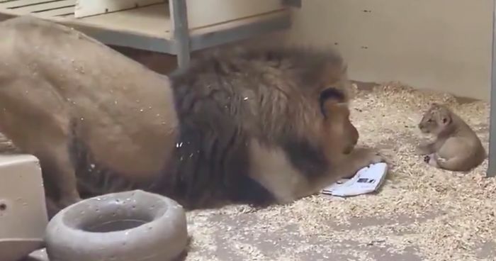 The video shared on September 6, 2019, showcases a lion cub playing around in its enclosure. Although the spotlight is obviously on the tiny lion baby, the moment shared between him and his lion daddy is the star of the footage. The two generations met for the first time and the big lion Tobias’ actions towards his small bean of a son as he crouched down to interact won over the internet immediately. Many praised this 2-year-old father for his gentle behavior.