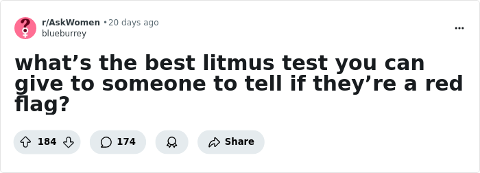 Someone asked women “what’s the best litmus test you can give to someone to tell if they’re a red flag?” and people detailed their best strategies. So get comfortable as you scroll through, upvote your favorites and be sure to share your own thoughts and experiences in the comments down below.