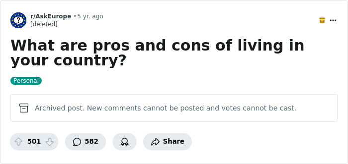 Cons: Awful wages compared to other countries, politics has been a s******w since forever, streets aren't as clean as I would like.