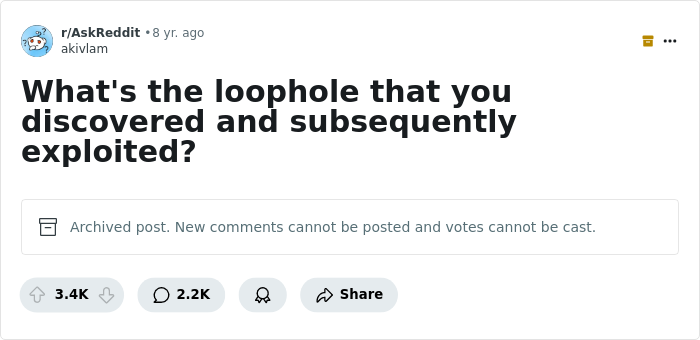 Someone asked people to share the times they found a loophole and went on to unashamedly exploit it. And there was no shortage of answers. Some of them came from cunning and clever masters who saw cracks in the system and dove right in. Others were chance situations that left people unexpectedly scoring much more than they had originally bargained for.