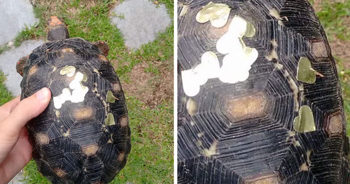 There were gold, heart-shaped party stickers on Odette’s back, and Tavares couldn’t explain it. When the man shared the photo of Odette with stickers on her back on Facebook, one of his friends who lived nearby solved the mystery. She said she saw the same turtle in her niece’s 2nd birthday party.