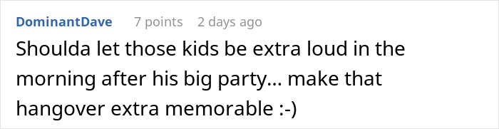 But the kids’ parents, including QueenPotat-the1st’s mom, thought that he was being a hypocrite since the guy would often host late-night parties himself, and decided to award the fella with even more noise instead.