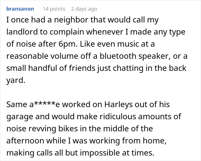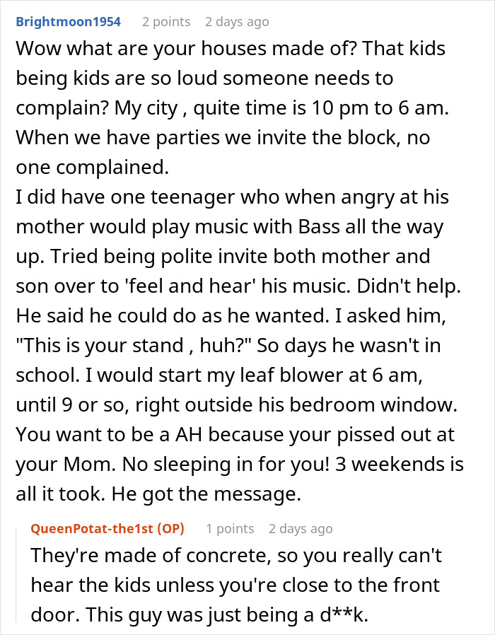 “As I mentioned in a comment, the houses are made of concrete and you can’t hear that much noise unless you’re at the front door,” they added. “I know this because the kids usually play outside my mum’s house. When she does get complaints about the kids, they usually wind down, but it hasn’t happened that many times. I do think this guy was just being a [jerk].”