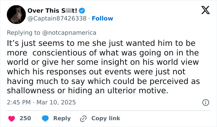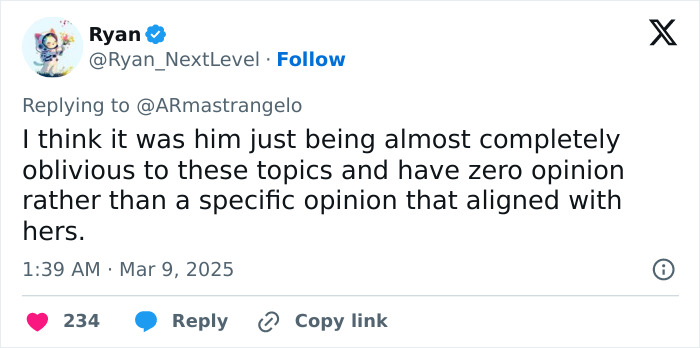 My BF in Germany in the 90s voted 'Conservative'. That means, he was for being careful when changing things. Conservative in today's USA means you support rapists, women being seen as breeding mares, anti-vaxx, anti-trans or anti-LBGTQ+ as a whole etc. It's also very telling that people call her a bad person although she doesn't say anything bad about the guy, just that they're not on the same wavelength. See, THAT are the USA's conservatives: a woman isn't to say "no", if she does, she is bad. Instant proof of why she was right to act like she did.