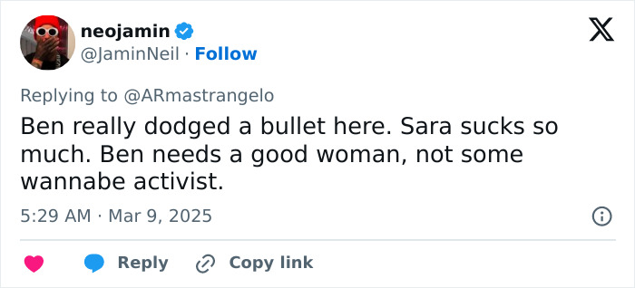 Sara faced backlash for her decision, with some people saying, “Ben dodged a bullet”