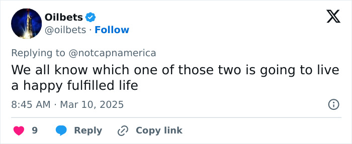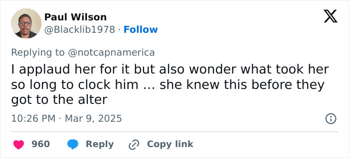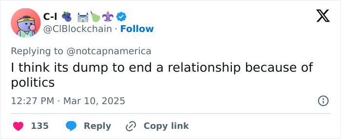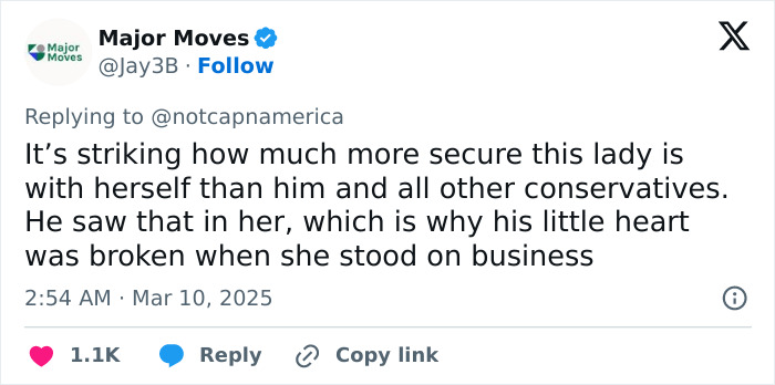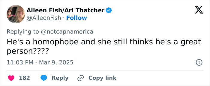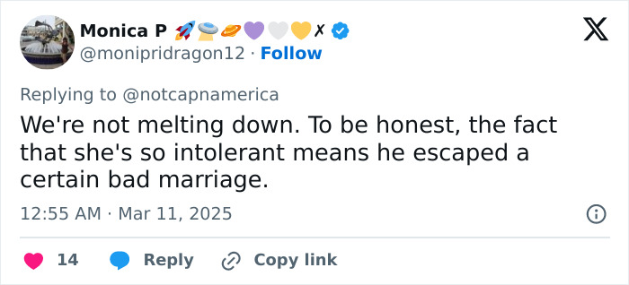 In response to a tweet about conservatives “melting down” over the breakup, one said, “We’re not melting down. To be honest, the fact that she’s so intolerant means he escaped a certain bad marriage.”