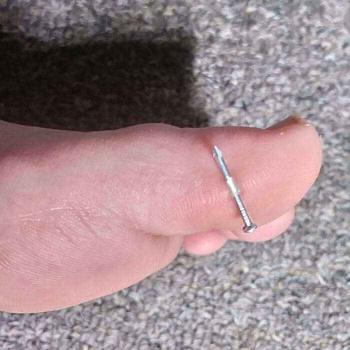 Tripped And Shot My Boot With A 3 1/2" Framing Nail. Went Between My Toes Leaving Just A Minor Scratch