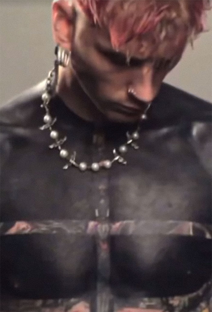 Machine’s blackout piece, a type of tattoo that involves covering a large area of the skin with solid black ink, essentially creating a solid block of color, extends from his upper chest all the way to both of his arms, leaving some fine lines that let his old tattoos barely show.