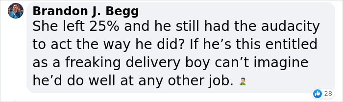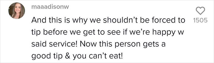 Load More Replies...Compulsory/expected tipping is crazy. If you CHOOSE to give someone a tip it's an additional little "thanks for the lovely service", shouldn't be relied upon because your boss doesn't pay you a proper wage - which, by the way, isn't the customers fault. I'm glad I don't live in a country where that happens, actually maybe it'd be a good thing because I'd literally never order out 😂.