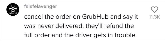GrubHub, like many other meal delivery services, allows customers to leave a tip at the checkout, and Hunter revealed she left a 26% tip. However, that didn’t sit well with the driver. He decided to get payback and leave the order in the middle of her gravel driveway. The clip, where she explains the situation in great detail, quickly went viral and has amassed over 2.8M views at the time of writing.