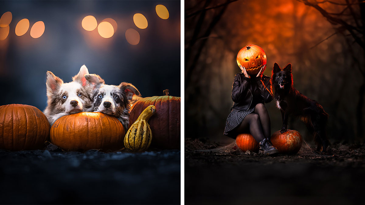 One of my favorite photos from this series has to be of my border collie, Cirilla. She placed her paw on a pumpkin and was covered in spider webs, all while lowering her head to give an intense look. I’d asked her to do a different pose, but she kept raising her paw in the air, which ended up working perfectly. She has a knack for suggesting poses herself! Another favorite is my younger border collie, Zireael, illuminated by a red rim light. It truly captures her personality—charmingly cute but with a hint of mischief!