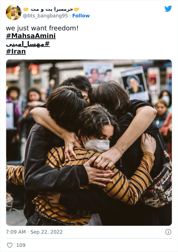 Im so happy the world hears about this. And so so sad it took another young life to make it heard. But please - on all your platforms - Instagram, Facebook, Twitter, TikTok, Snap, what ever, share the story of Iran and the horror it lives through since 1979. Make their lives not lost in vain. This is not Islam. This is some stupid idiot totalitarian regime that dictates as it sees fit. Not as the religion it claims to adhere to sees. (I'm not religious - but in essence, the religion was supposed to be peaceful. Some men had to go mess it up.. )