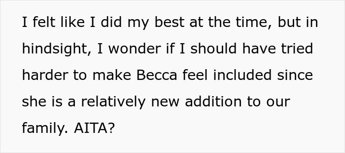 After the confrontation, the brother and his family left, which brought the whole family’s mood down. The woman can’t help but wonder where she went wrong, as she was just trying to look out for Becca but was accused of not accepting her as family instead.