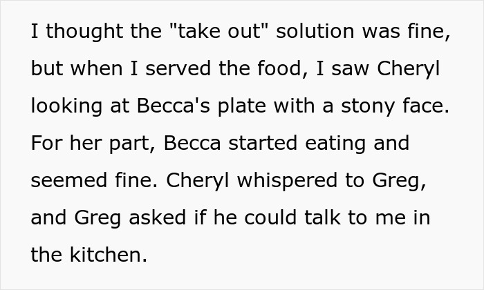 The brother was so angry that the sister couldn’t even say a word and explain that she thought this was the safest way to serve Becca dinner. He was worried about how disappointed Becca would feel as he and his wife were praising how well her step-aunt can cook.