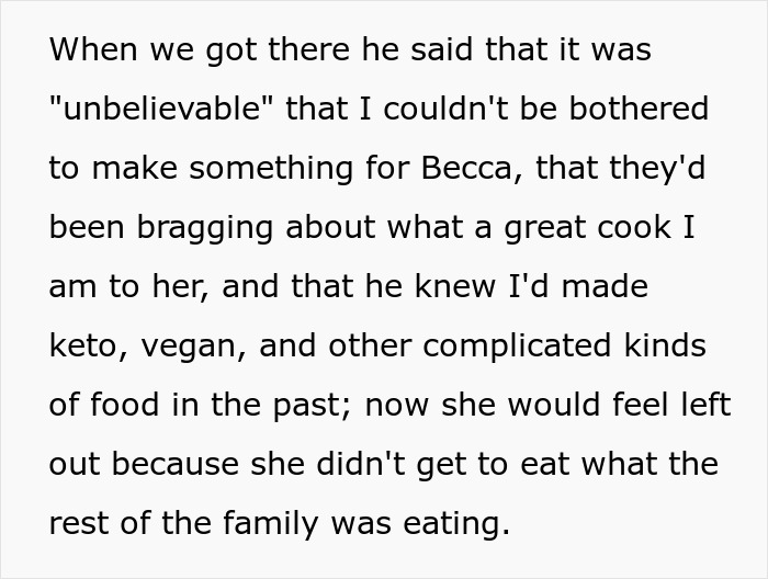Do you think the OP still could have put in more effort in order to not make Becca feel left out? Do you think such treatment could have made the girl feel left out when she knows she can’t eat the same as everyone else because of her allergies? What do you think of her mom and stepdad’s reaction? Let us know your thoughts in the comments.