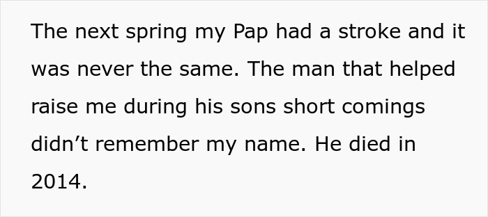 OP’s dad’s parenting left much to be desired, so his parents, OP’s grandparents, picked up a lot of slack. And, thankfully, were more than great at it. Not only was dad’s relationship with OP rocky, his relationship with his parents seemed even worse. To a degree where he didn’t seem all that fazed by how his also seemingly dysfunctional wife shoved his 74-year-old dad in a way that left him literally injured. This was the last straw for OP—she knew she could never forgive him for it.