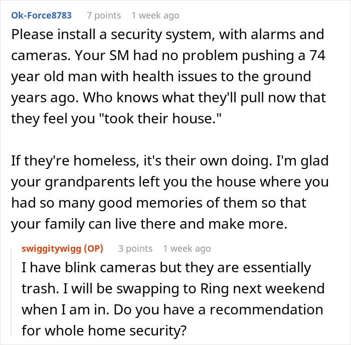 Others suggested one-upping the current security setup which would include more than just cameras and changing locks—maybe an actual security alarm. If OP’s stepmother doesn’t have a problem pushing a senior citizen, there is an increased non-zero chance of them getting themselves into more criminal trouble.