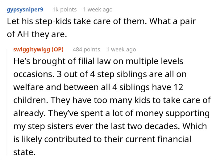 In particular, there are 4 other people in the equation who could possibly help the dad, i.e. OP’s stepsiblings. While it’s understandable why they don’t do it—OP noted that 3 of the 4 stepsiblings are on welfare—but if they care so much about the well-being of their own parents, they can make an effort.