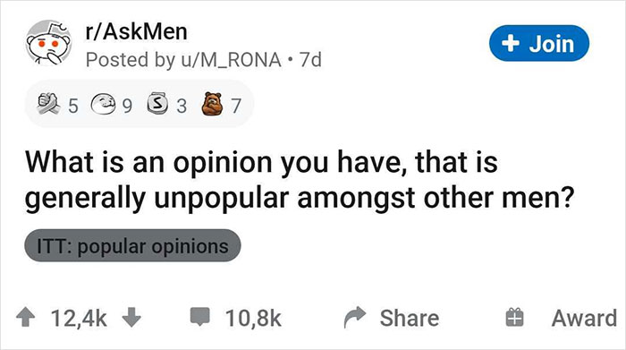 Redditor M_RONA asked them to share their opinions that are generally unpopular among men, and they’ve been opening up about their honest thoughts. Candid, some might say even vulnerable, these opinions are bound to resonate with quite a few readers who might think the same but might find it difficult to talk about in public for fear of being ostracized.