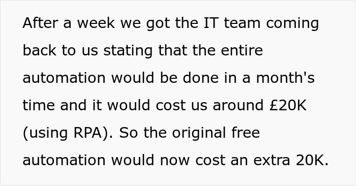 A week later, the IT team reported that it would take a month to develop and implement their own automation solution, and all this would cost £20K (using RPA). Just let us remind you that the initial solution was free. Of course, the stakeholder was not happy and suggested to move the whole process to a third party. In the end, so it turned out and the third party did the automation free of cost. True, while employees got redeployed, as the OP recalls, it still cost the offshore unit £1 million, which was the cost of their team every year.