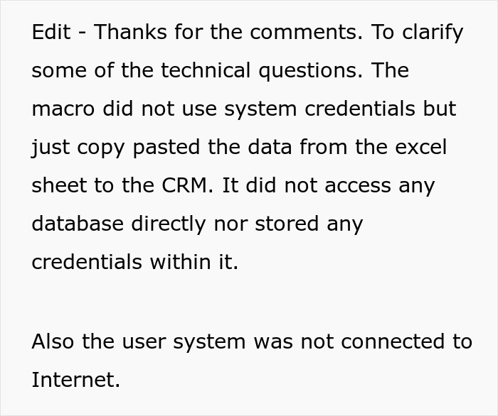 As the original poster recalls, it was hardly a security threat – the macro did not use system credentials and, of course, did not have access to the internet. But nevertheless, the new boss demanded that everything be fixed immediately. “Fix everything” in his understanding meant immediately closing the automatic activation of SIM cards and making a request to the IT department to develop their own solution – but for now, do everything manually in the old-fashioned way.