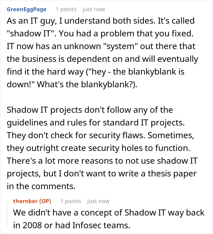 As some people said in the comments, here, in principle, both sides can be understood, and this is called “shadow IT”. Just imagine that you have an issue that you fixed with some external solution. But now the IT comes into play, for which it is nothing more than an unknown “system” on which an entire business now probably depends. And it’s unclear to them what could be done about it.