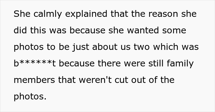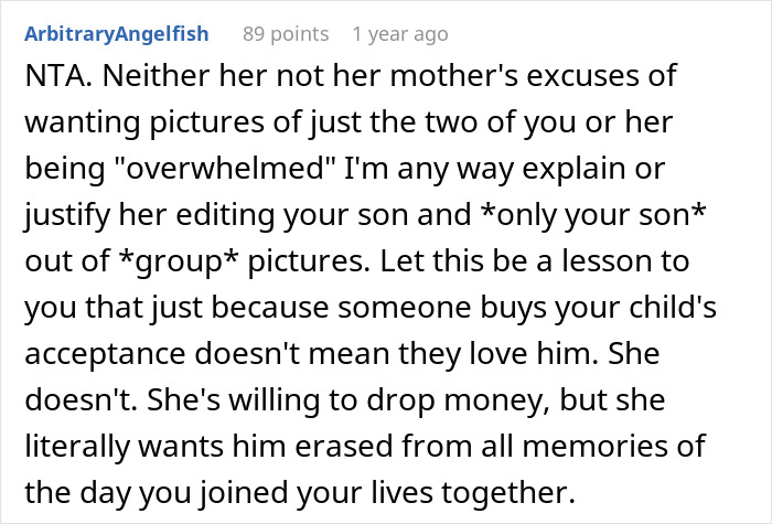 Load More Replies...Going to the original source makes it a bit clearer. It sounds like OP tried to put the kid in every photo when it wouldn't have been appropriate and the wife wanted a few that had the normal separated groups. The details that explain that the wife hasn't removed him from all of them and that some of those instead included certain groups like grandparents is a big clue. It's fair enough that the dad is a bit over the top with the kid, but people shouldn't be so quick to blast the wife as an abuser just because she wanted a few traditional photos.