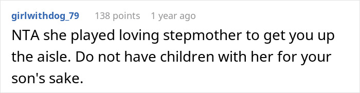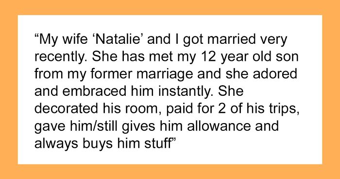 Load More Replies...I agree with the comments, this reeks of "buttering up the son to get to the father". Read it again and pay attention to OP's description of the wife's "love" for her stepson. ALL of the things he lists are connected to money or spending money on the son. She didn't really "do" anything to earn his love, she threw money at him. I'm sorry to say this, but "Natalie" will most likely not care a lot about OP's son now that they are legally married.