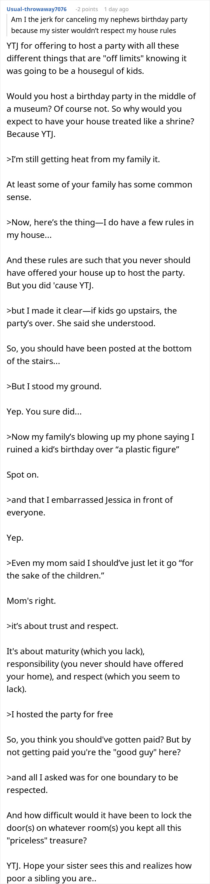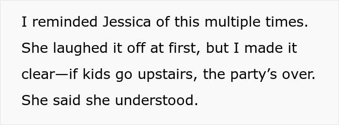 Load More Replies...Of course you can tell children they are not allowed to go upstairs. After all, you also tell them they can't hit each other or call each other names. Children are not incapable of following rules. If they are young, you need someone there to enforce the rules: the sister dropped the ball on this one. "For the sake of the children' is never 'for the sake of the children' because children need to learn that actions have consequences and not ending the party would mean rewarding unwanted behaviour.
