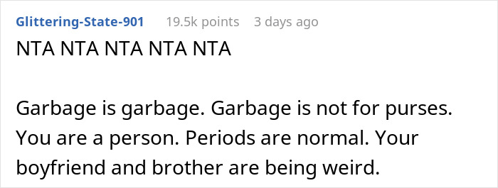 After all, men don’t have to deal with all the exhausting side effects of a period, including tiredness, heightened sensitivity, and outright pain. A little garbage seems like a more than fair trade-off. Less than a third of women experience cramps intensive enough to disrupt daily activities. So imagine, as a woman, going through multiple days of pain, then having your partner, who is supposed to be a support, get angry for changing a pad, as you should. OP was admirably calm and collected, asking for advice online when it seems, the vast majority of people would have dumped this guy on the spot. Unfortunately, both the boyfriend’s and brothers’ reactions are way too common, as menstruation still bears a lot of stigma and misinformation.