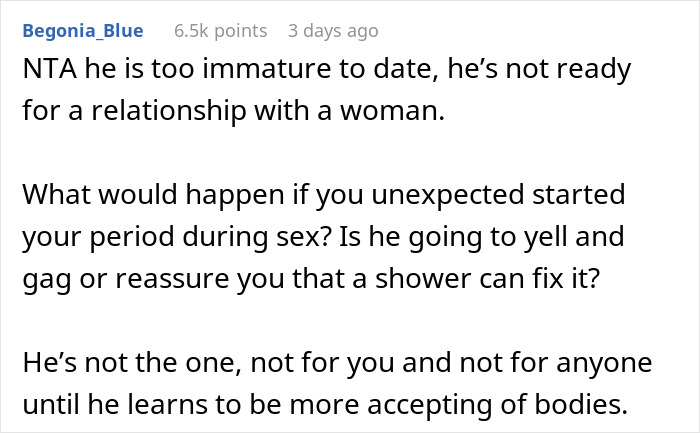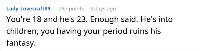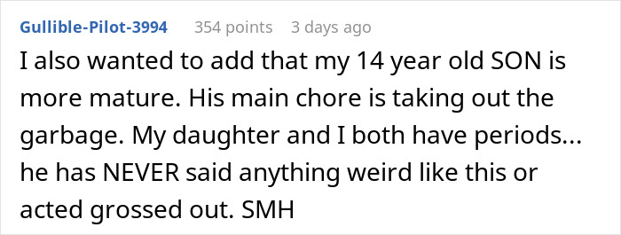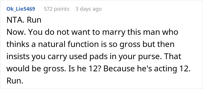 Load More Replies...She needs to run and fast, he is demeaning her for dealing responsibly with a normal human function. The fact he finds period blood disgusting means he finds some integral to her as a living being disgusting. If it was on the toilet seat or other and not cleaned up OK, even we women find that disgusting but it was sealed and properly disposed of fgs.