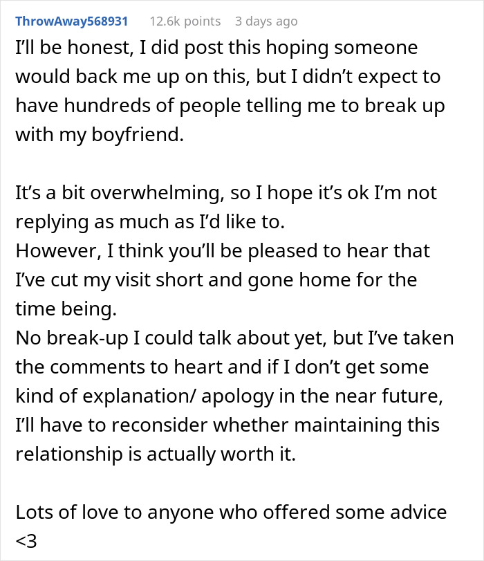 Commenters very explicitly told OP to dump her boyfriend and that she was absolutely not at fault