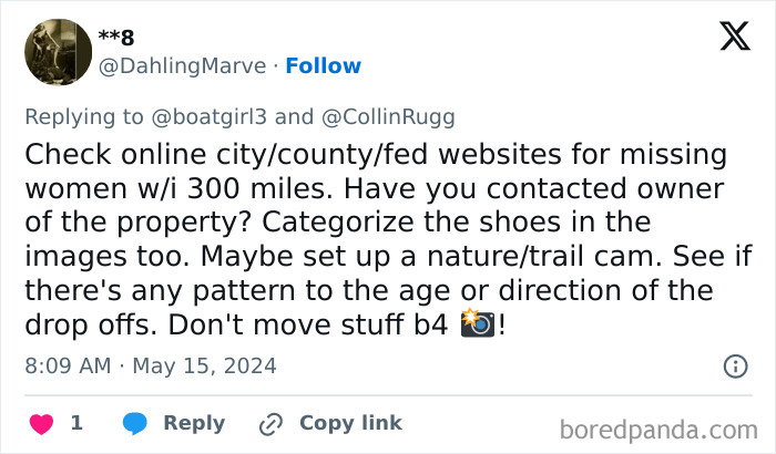Women's shoes only though. Not men's or children's shoes. If it was just people illegally dumping, wouldn't there be more than just women's shoes?